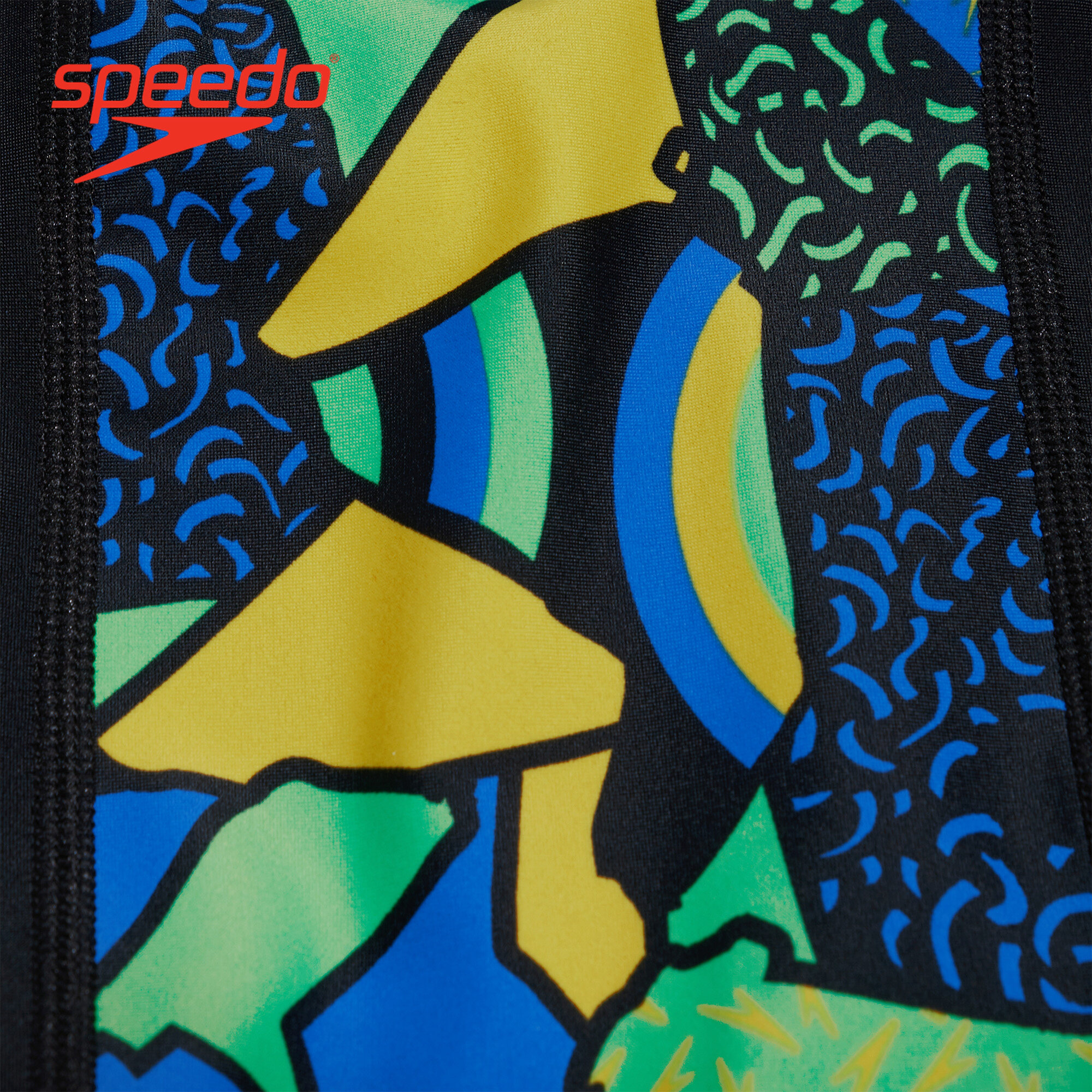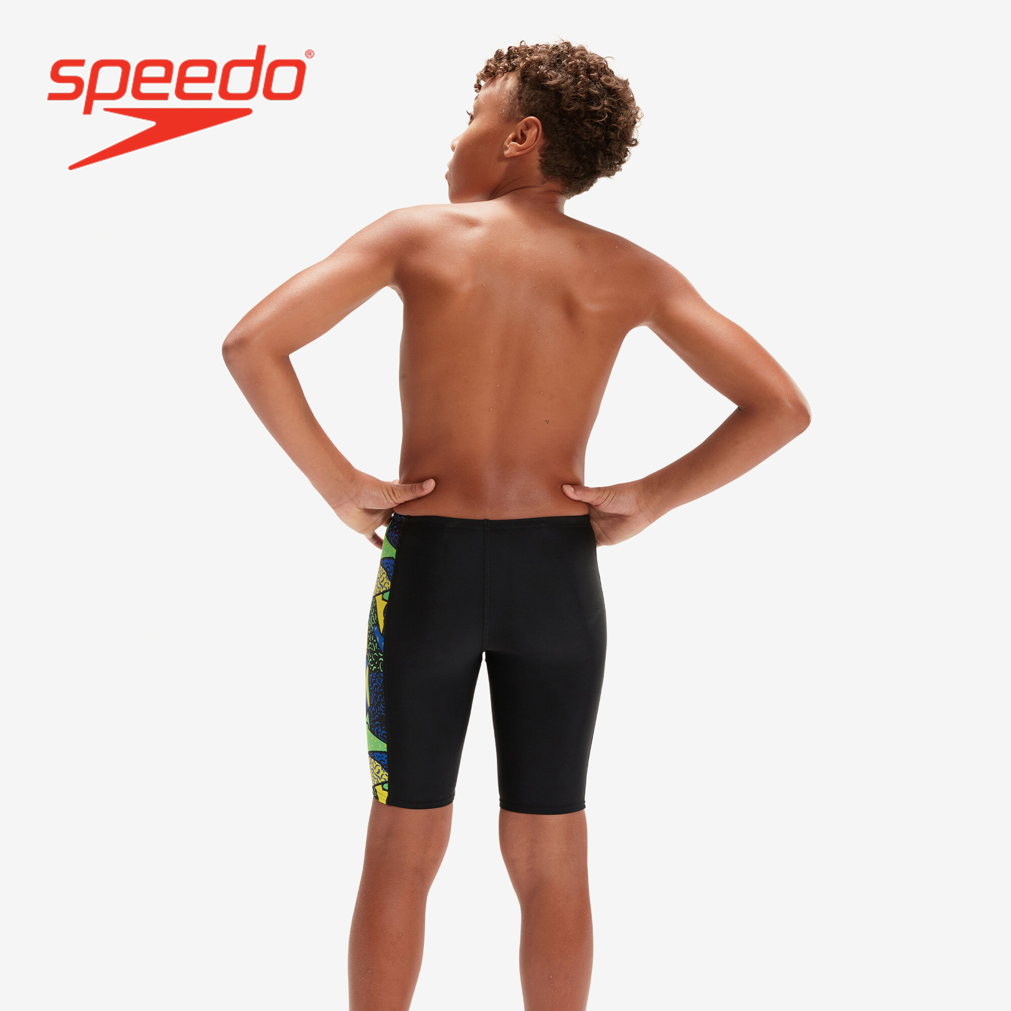 • Style and comfort for lessons and training. Ooze confidence wearing this sleek black Jammer, which features side panels of our high-energy abstract print in bright yellow, green and blue. Lined at the front for comfort and modesty, the jammer includes an internal drawcord to allow your child to achieve a secure and comfortable fit. Providing higher chlorine resistance than standard swimwear fabrics, it offers excellent shape retention and fits like new for longer with CREORA® HighClo. If you’re looking for great eco-credentials, it’s got those, too: our exclusive Eco EnduraFlex fabric is made from 100% recycled pre-consumer waste, such as fabric waste from factories.